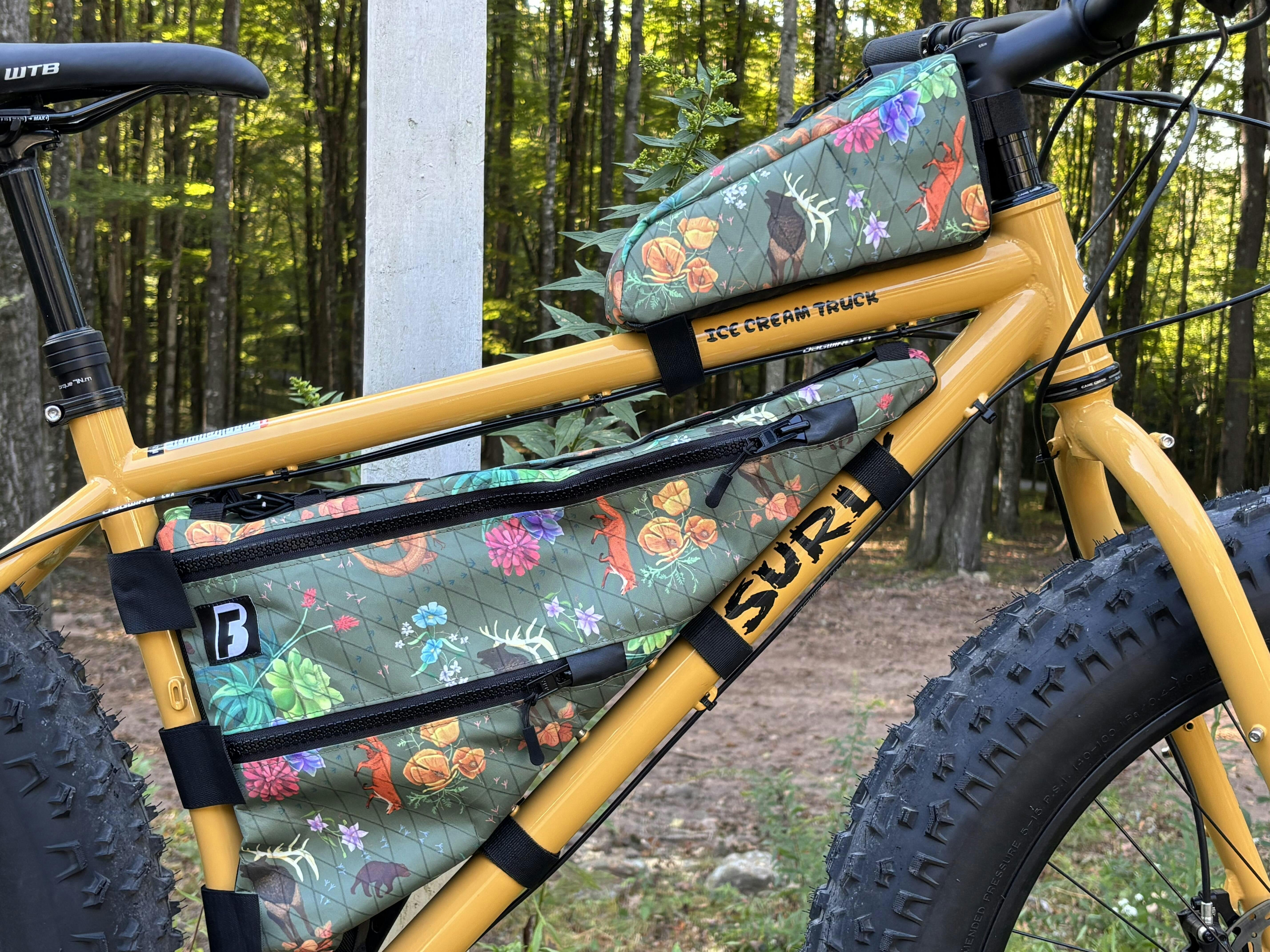 The Frame Bag is fully custom to fit your frame perfectly, constructed with the technical fabric of your choice. Custom printed fabrics are available and combinations of fabrics are possible so you can express yourself and have the frame bag of your dreams!